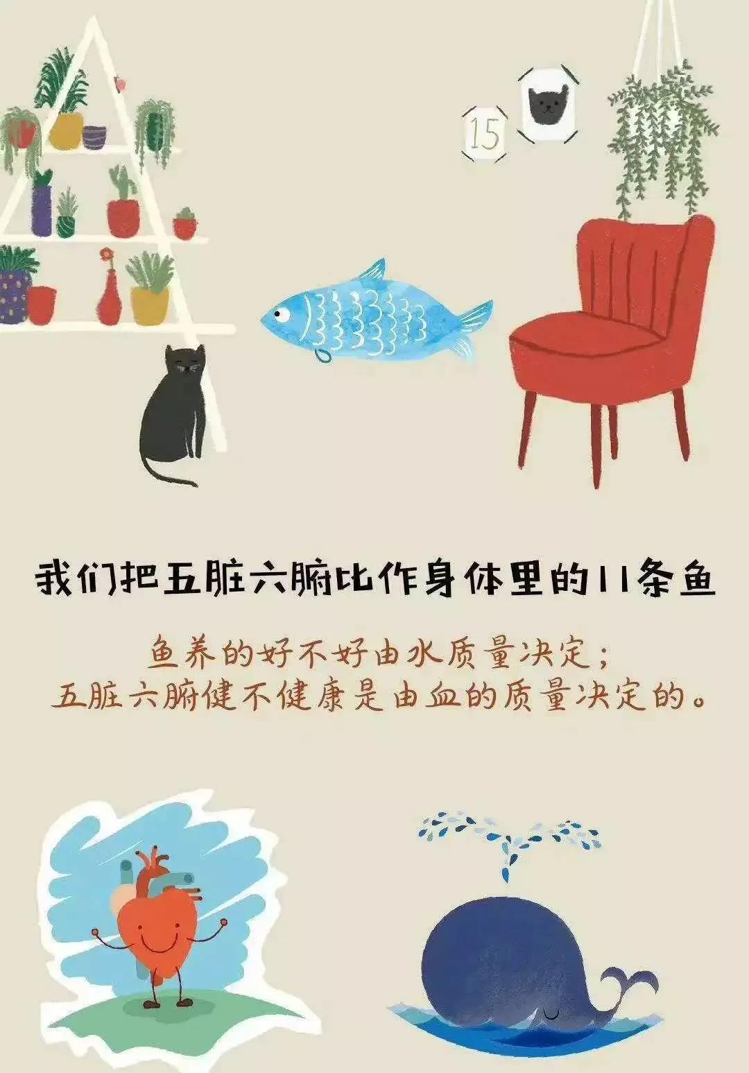 我们的身体里也养了11条鱼,这11条鱼就叫五脏六腑。这11个脏器是由我们的血液来养的,养的好不好由血质来决定,那血质好不好怎样才能知道呢?那就需要我们到医院抽血、化验大小便来查。